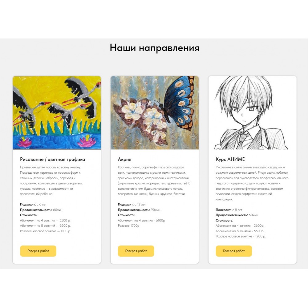 Независимо от того, нужен ли вам простой сайт-визитка или сложный интернет-магазин, мы готовы воплотить ваши идеи в реальность. Свяжитесь с нами уже сегодня и начните привлекать больше клиентов с помощью профессионального и эффективного Лендинга для вашей арт-студии.